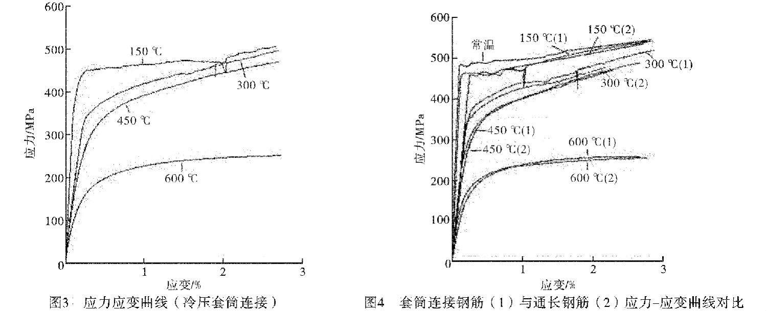 通過處理實(shí)驗(yàn)數(shù)據(jù),得到了高溫下采用不同套筒連接的鋼筋的應(yīng)力-應(yīng)變曲線,如圖2、圖3所示。并且與通長(zhǎng)鋼筋在高溫及常溫下的應(yīng)力-應(yīng)變曲線作對(duì)比(圖4),可以看出采用套筒連接的鋼筋與無(wú)連接形式的鋼筋的應(yīng)力-應(yīng)變曲線幾乎是吻合的,可以認(rèn)為鋼筋在高溫下采用套筒連接對(duì)其應(yīng)力-應(yīng)變曲線影響較小。