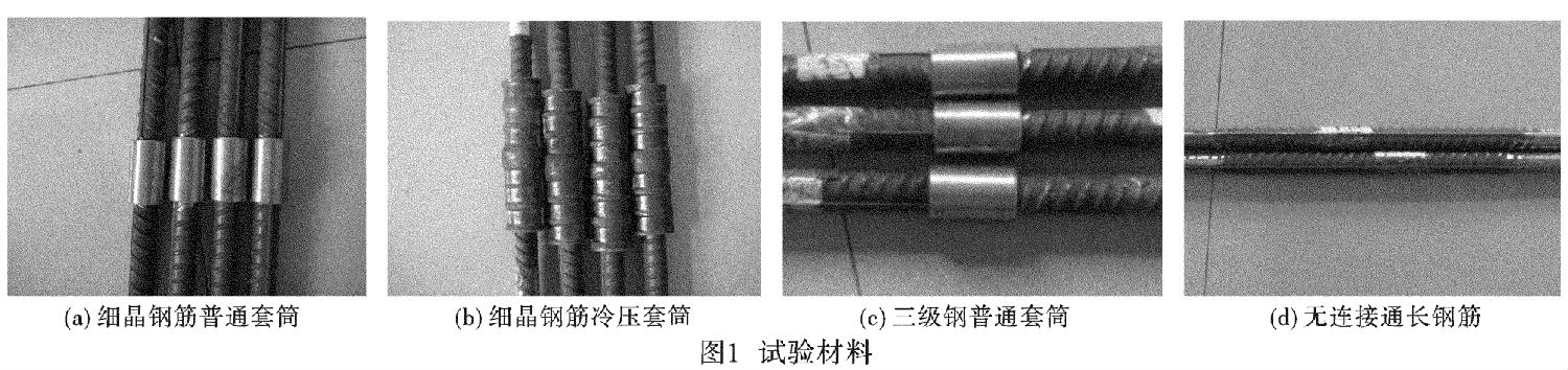 采用的鋼筋連接套筒由中國(guó)建筑科學(xué)研究院建碩股份有限公司設(shè)計(jì)并提供,選用兩種不同類別的鋼筋連接套筒接頭——普通套筒與冷壓套筒,套筒均按三級(jí)鋼做成。試件分3組,共11根,其中4根為細(xì)晶鋼筋普通套筒連接、4根為細(xì)晶鋼筋冷壓套筒連接、3根為普通三級(jí)鋼普通套筒連接,如圖1所示。鋼筋直徑都為20mm。