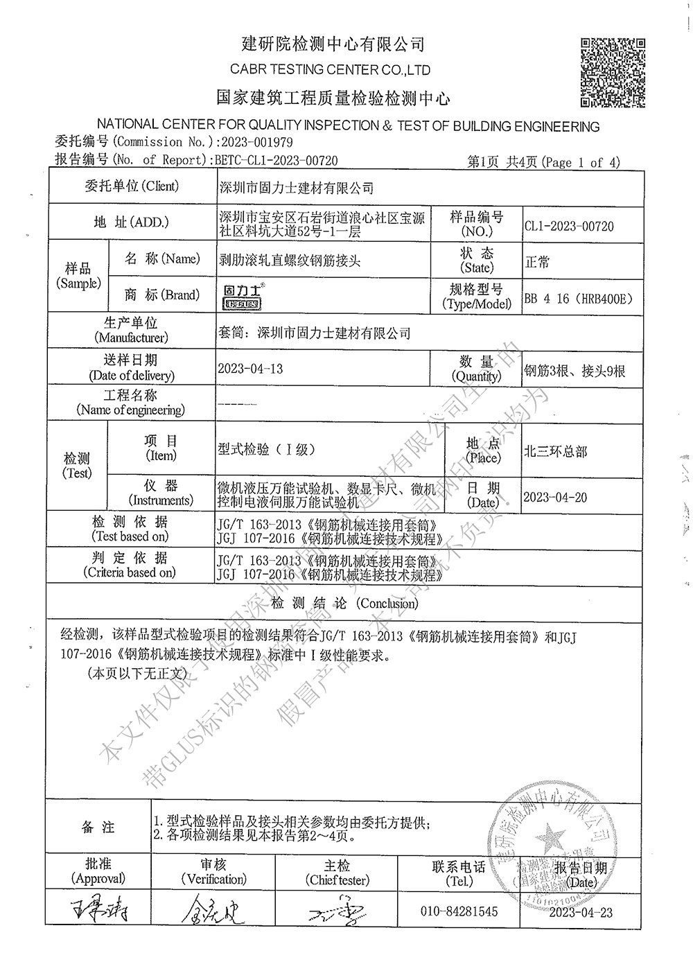 固力士鋼筋機(jī)械連接用套筒2023年型式檢驗(yàn)報(bào)告